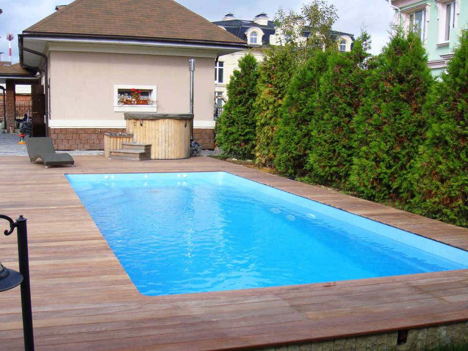 Самый дешевый и простой вариант – купить надувной либо модульный наземный бассейн и собрать его прямо на настиле. Преимущество этих бассейнов в их мобильности: в холодную пору конструкция убирается. Однако стационарные конструкции солиднее, долговечнее, разнообразнее по размерам и дизайну. Сегодня производители предлагают встраиваемые чаши из винила и стеклопластика – сотни моделей на любой выбор! А тем, кому хочется уникального дизайна, рекомендуется отлить бетонную чашу.