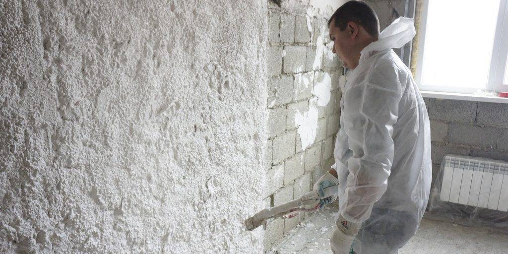 - Первый слой — обрызг. Раствор, по консистенции напоминающий густую сметану, набрасывают на стену, и дают подсохнуть. При обрызге движения резкие, но не размашистые, чтобы смесь не разлеталась.