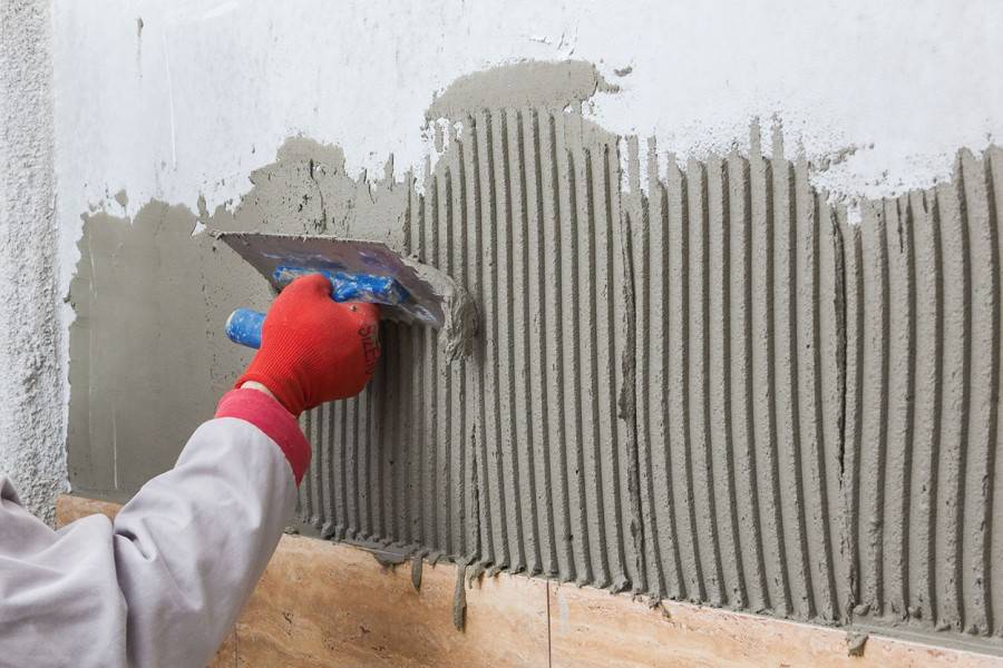 Также плиточный клей наносят на стены как промежуточный слой с армированием сеткой. Далее его можно покрыть гипсовой или цементной штукатуркой.