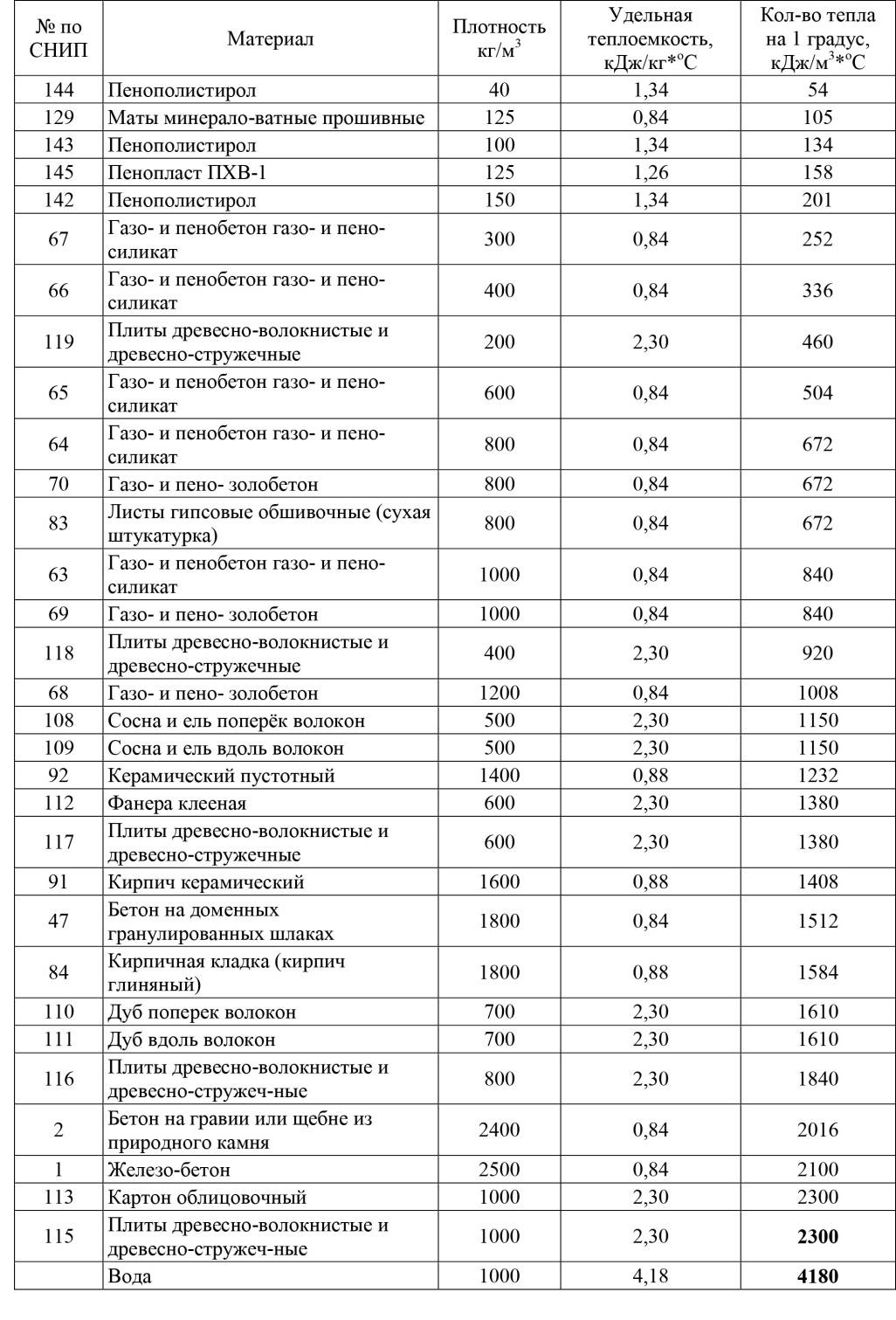 Теплоемкость материалов, таблица по которой приведена выше, зависит от плотности и коэффициента теплопроводности материала.