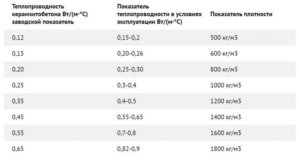 В таблице указана прямая зависимость теплопроводности керамзитобетона от его плотности: