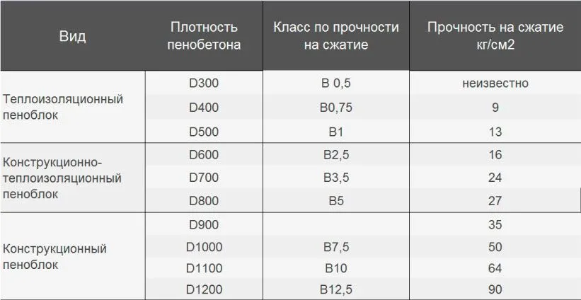 Для ячеистых бетонов важна такая характеристика, как объемная масса, то есть вес единицы объема – 1 куб. м. По этому показателю и пено- и газобетоны разделяют на три категории: