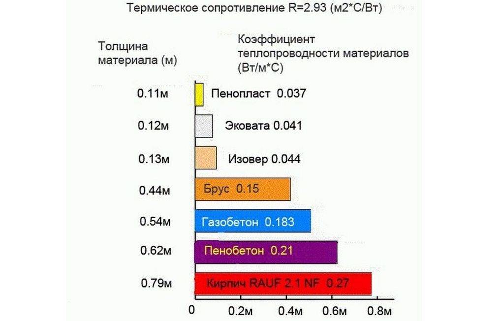 Для более понятного объяснения можно сравнить толщину стен обеспечивающих одинаковое сохранение тепла в доме: