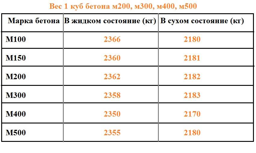Приведенная ниже кг м3 таблица отображает приблизительный вес материала в зависимости от его марки. Проще говоря — это средняя плотность бетона.