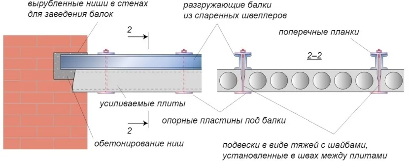 Допускается усиление плит перекрытия металлическими балками сверху. Этот вариант предпочтительнее, когда интерьер нижнего этажа не хочется портить массивными конструкциями. Балку укладывают вдоль стыка плит торцами на несущие стены или в вырубленные в них ниши и притягивают к ним плиты подвесками с опорными пластинами.