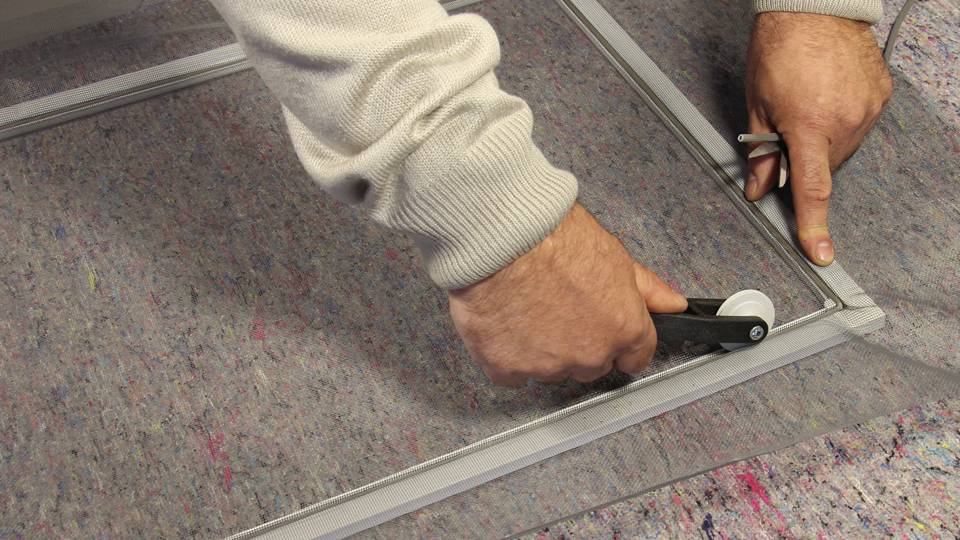 Если в процессе сетка легла криво, шнур можно вытянуть, поддев отверткой или чем-то похожим, поправить, и закатать снова. Закончив натяжку, проверяете в нескольких точках ширину и высоту рамки. Если где-то есть отклонения, значит в этом месте сетка натянута слишком сильно Ее ослабляют, надавив немного ладонью возле рамы. Если так не получается выровнять ширину, шнур поддевают и вытаскивают на каком-то промежутке. выровняв ширину, придерживая сетку, снова заправляют.