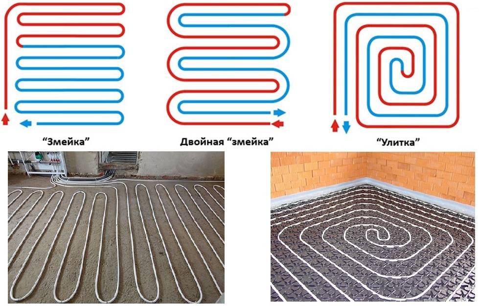 Для водяного теплого пола есть несколько схем раскладки труб. Способ распределения теплоносителя определяют в зависимости от условий эксплуатации системы.