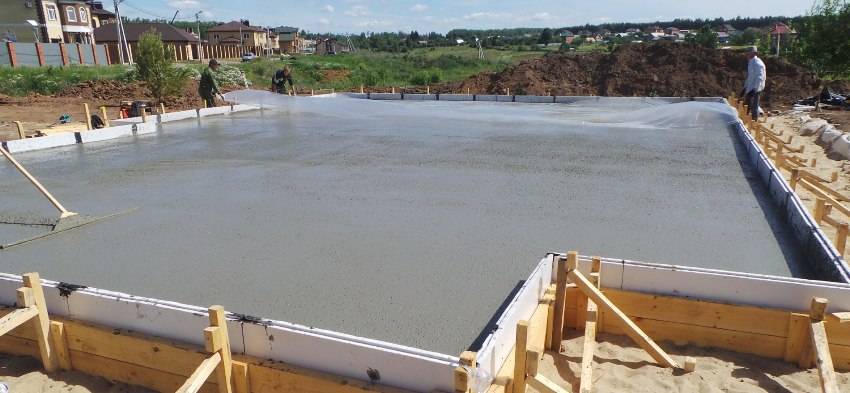 Про заливку бетонной стяжки мы рассказывать не будем. Скажем лишь, что опалубка для плиты не нужна, так как ею является ленточный фундамент по периметру здания. Имеет смысл добавлять в бетон пенетрирующие добавки для надежной гидроизоляции конструкции. Также с помощью битумной мастики и оклеечной гидроизоляции производится гидроизоляция фундамента своими руками по внешнему периметру.