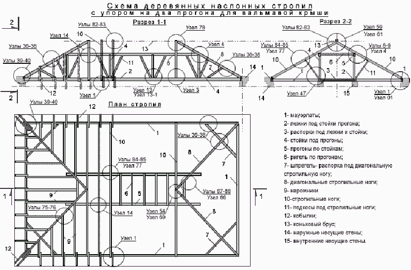 При сооружении вальмовых и шатровых каркасов используются такие специфические узлы стропильной системы четырехскатной крыши: