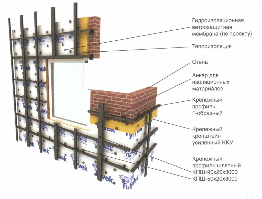 Конструктивно устройство вентфасада можно представить в виде пирога, состоящего из трех слоев: несущая система профилей (каркас), теплоизоляционный материал и защитный экран (облицовочный материал).