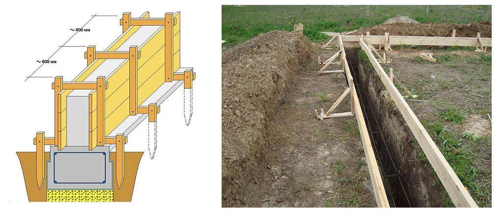 Опалубка основания для забора выполняется также как и для обычного фундамента, с той лишь разницей, что армированное основание обустраивать не требуется