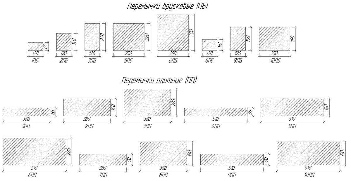 В зависимости от конструкции зданий и предъявляемых эксплуатационных требований, ГОСТ на железобетонные перемычки предусматривает следующие типы изделий: